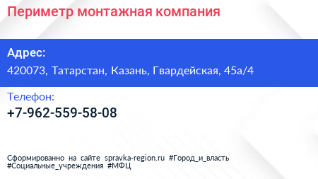 Периметр, монтажная компания по адресу 420073, Татарстан, Казань, Гвардейская, 45а/4 в дальнейшем Организация, размещена в следующих категориях: