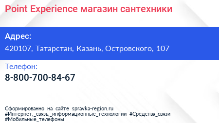 Point Experience, магазин сантехники по адресу 420107, Татарстан, Казань, Островского, 107 в дальнейшем Организация, размещена в следующих категориях: