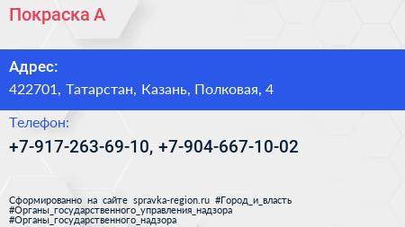 Покраска-А по адресу 422701, Татарстан, Казань, Полковая, 4 в дальнейшем Организация, размещена в следующих категориях: