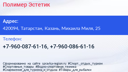 Полимер Эстетик по адресу 420094, Татарстан, Казань, Михаила Миля, 25 в дальнейшем Организация, размещена в следующих категориях: