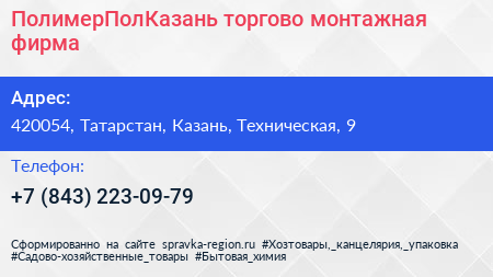 ПолимерПолКазань, торгово-монтажная фирма по адресу 420054, Татарстан, Казань, Техническая, 9 в дальнейшем Организация, размещена в следующих категориях: