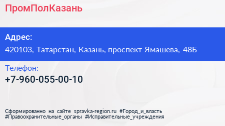 ПромПолКазань по адресу 420103, Татарстан, Казань, проспект Ямашева, 48Б в дальнейшем Организация, размещена в следующих категориях: