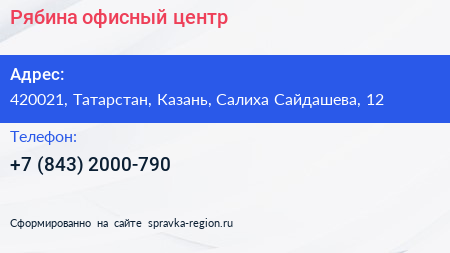 Рябина, офисный центр по адресу 420021, Татарстан, Казань, Салиха Сайдашева, 12 в дальнейшем Организация, размещена в следующих категориях: