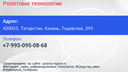 Ролетные технологии по адресу 420051, Татарстан, Казань, Тэцевская, 295 в дальнейшем Организация, размещена в следующих категориях: