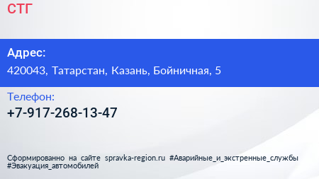 СТГ по адресу 420043, Татарстан, Казань, Бойничная, 5 в дальнейшем Организация, размещена в следующих категориях: