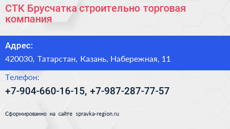 СТК Брусчатка, строительно-торговая компания по адресу 420030, Татарстан, Казань, Набережная, 11 в дальнейшем Организация, размещена в следующих категориях: