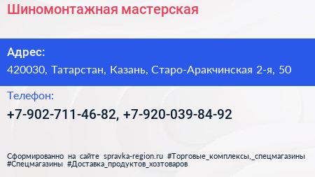 Шиномонтажная мастерская по адресу 420030, Татарстан, Казань, Старо-Аракчинская 2-я, 50 в дальнейшем Организация, размещена в следующих категориях:
