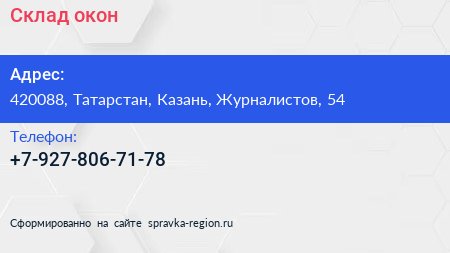 Склад окон по адресу 420088, Татарстан, Казань, Журналистов, 54 в дальнейшем Организация, размещена в следующих категориях: