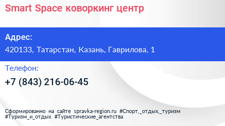 Smart Space, коворкинг-центр по адресу 420133, Татарстан, Казань, Гаврилова, 1 в дальнейшем Организация, размещена в следующих категориях: