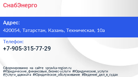 СнабЭнерго по адресу 420054, Татарстан, Казань, Техническая, 10а в дальнейшем Организация, размещена в следующих категориях: