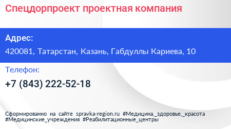 Спецдорпроект, проектная компания по адресу 420081, Татарстан, Казань, Габдуллы Кариева, 10 в дальнейшем Организация, размещена в следующих категориях: