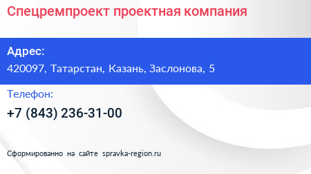 Спецремпроект, проектная компания по адресу 420097, Татарстан, Казань, Заслонова, 5 в дальнейшем Организация, размещена в следующих категориях: