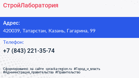 СтройЛаборатория по адресу 420039, Татарстан, Казань, Гагарина, 99 в дальнейшем Организация, размещена в следующих категориях: