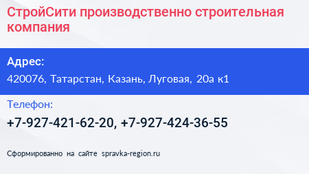 СтройСити, производственно-строительная компания по адресу 420076, Татарстан, Казань, Луговая, 20а к1 в дальнейшем Организация, размещена в следующих категориях: