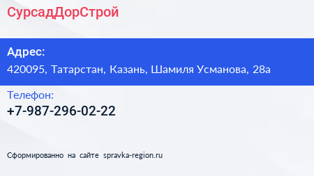 СурсадДорСтрой по адресу 420095, Татарстан, Казань, Шамиля Усманова, 28а в дальнейшем Организация, размещена в следующих категориях: