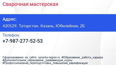 Сварочная мастерская по адресу 420129, Татарстан, Казань, Юбилейная, 2Б в дальнейшем Организация, размещена в следующих категориях: