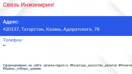 Связь Инжиниринг по адресу 420137, Татарстан, Казань, Адоратского, 78 в дальнейшем Организация, размещена в следующих категориях: