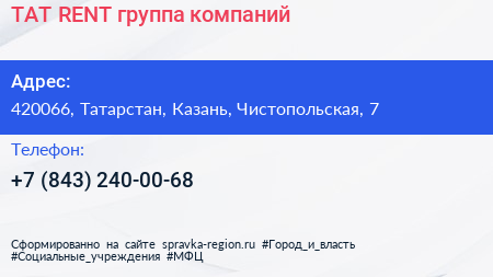 TAT.RENT, группа компаний по адресу 420066, Татарстан, Казань, Чистопольская, 7 в дальнейшем Организация, размещена в следующих категориях: