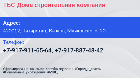 ТБС Дома, строительная компания по адресу 420012, Татарстан, Казань, Маяковского, 20 в дальнейшем Организация, размещена в следующих категориях: