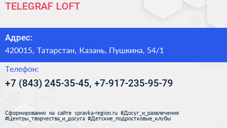 TELEGRAF LOFT по адресу 420015, Татарстан, Казань, Пушкина, 54/1 в дальнейшем Организация, размещена в следующих категориях: