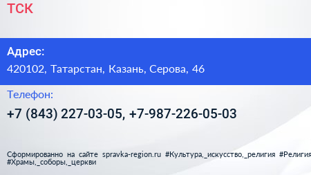 ТСК по адресу 420102, Татарстан, Казань, Серова, 46 в дальнейшем Организация, размещена в следующих категориях:
