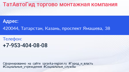 ТатАвтоГид, торгово-монтажная компания по адресу 420044, Татарстан, Казань, проспект Ямашева, 38 в дальнейшем Организация, размещена в следующих категориях: