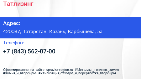 Татлизинг по адресу 420087, Татарстан, Казань, Карбышева, 5а в дальнейшем Организация, размещена в следующих категориях: