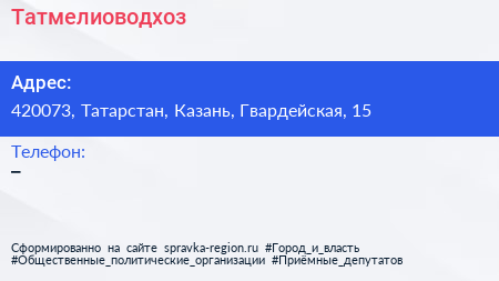 Татмелиоводхоз по адресу 420073, Татарстан, Казань, Гвардейская, 15 в дальнейшем Организация, размещена в следующих категориях:
