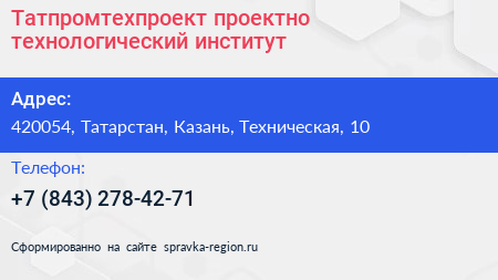 Татпромтехпроект, проектно-технологический институт по адресу 420054, Татарстан, Казань, Техническая, 10 в дальнейшем Организация, размещена в следующих категориях: