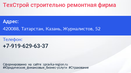 ТехСтрой, строительно-ремонтная фирма по адресу 420088, Татарстан, Казань, Журналистов, 52 в дальнейшем Организация, размещена в следующих категориях: