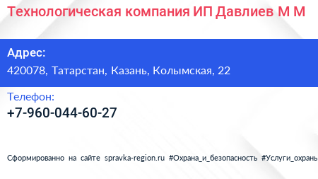 Технологическая компания, ИП Давлиев М.М. по адресу 420078, Татарстан, Казань, Колымская, 22 в дальнейшем Организация, размещена в следующих категориях: