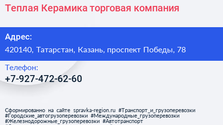 Теплая Керамика, торговая компания по адресу 420140, Татарстан, Казань, проспект Победы, 78 в дальнейшем Организация, размещена в следующих категориях: