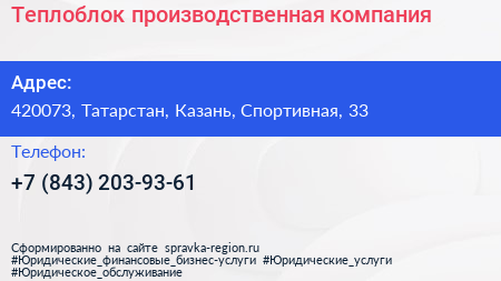 Теплоблок, производственная компания по адресу 420073, Татарстан, Казань, Спортивная, 33 в дальнейшем Организация, размещена в следующих категориях: