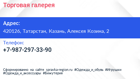 Торговая галерея по адресу 420126, Татарстан, Казань, Алексея Козина, 2 в дальнейшем Организация, размещена в следующих категориях: