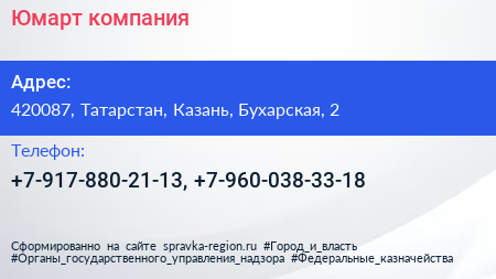 Юмарт, компания по адресу 420087, Татарстан, Казань, Бухарская, 2 в дальнейшем Организация, размещена в следующих категориях: