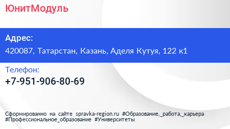 ЮнитМодуль по адресу 420087, Татарстан, Казань, Аделя Кутуя, 122 к1 в дальнейшем Организация, размещена в следующих категориях: