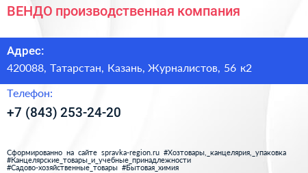 ВЕНДО, производственная компания по адресу 420088, Татарстан, Казань, Журналистов, 56 к2 в дальнейшем Организация, размещена в следующих категориях: