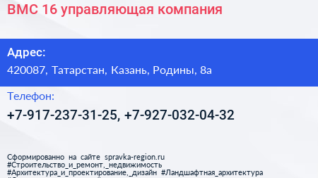 ВМС-16, управляющая компания по адресу 420087, Татарстан, Казань, Родины, 8а в дальнейшем Организация, размещена в следующих категориях: