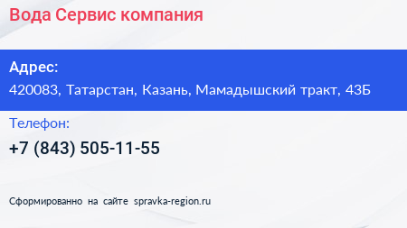Вода Сервис, компания по адресу 420083, Татарстан, Казань, Мамадышский тракт, 43Б в дальнейшем Организация, размещена в следующих категориях: