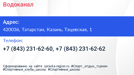 Водоканал по адресу 420036, Татарстан, Казань, Тэцевская, 1 в дальнейшем Организация, размещена в следующих категориях: