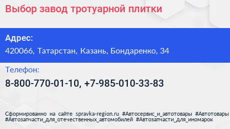 Выбор, завод тротуарной плитки по адресу 420066, Татарстан, Казань, Бондаренко, 34 в дальнейшем Организация, размещена в следующих категориях: