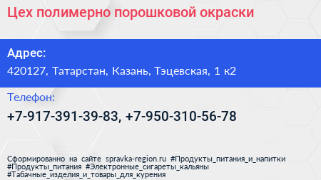 Цех полимерно-порошковой окраски по адресу 420127, Татарстан, Казань, Тэцевская, 1 к2 в дальнейшем Организация, размещена в следующих категориях: