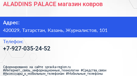 ALADDINS PALACE, магазин ковров по адресу 420029, Татарстан, Казань, Журналистов, 101 в дальнейшем Организация, размещена в следующих категориях: