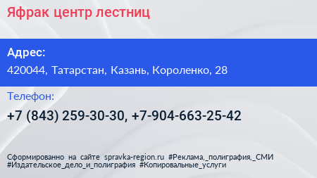 Яфрак, центр лестниц по адресу 420044, Татарстан, Казань, Короленко, 28 в дальнейшем Организация, размещена в следующих категориях: