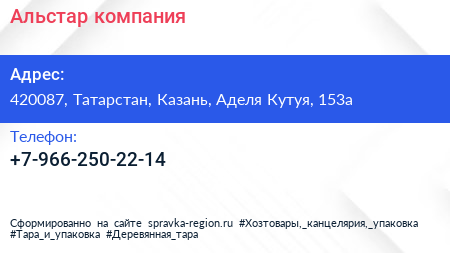 Альстар, компания по адресу 420087, Татарстан, Казань, Аделя Кутуя, 153а в дальнейшем Организация, размещена в следующих категориях: