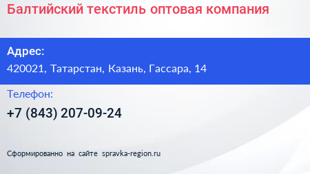 Балтийский текстиль, оптовая компания по адресу 420021, Татарстан, Казань, Гассара, 14 в дальнейшем Организация, размещена в следующих категориях: