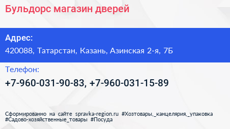 Бульдорс, магазин дверей по адресу 420088, Татарстан, Казань, Азинская 2-я, 7Б в дальнейшем Организация, размещена в следующих категориях: