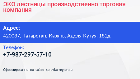 ЭКО-лестницы, производственно-торговая компания по адресу 420087, Татарстан, Казань, Аделя Кутуя, 181д в дальнейшем Организация, размещена в следующих категориях:
