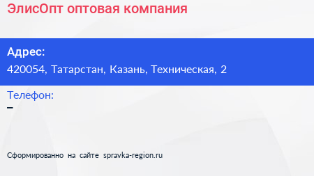 ЭлисОпт, оптовая компания по адресу 420054, Татарстан, Казань, Техническая, 2 в дальнейшем Организация, размещена в следующих категориях: