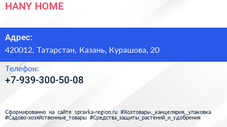 HANY HOME по адресу 420012, Татарстан, Казань, Курашова, 20 в дальнейшем Организация, размещена в следующих категориях: